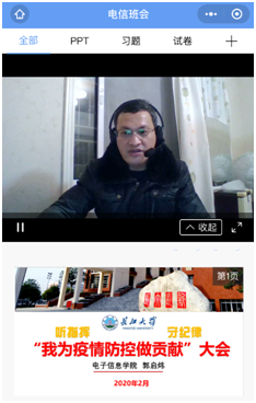 (通信员 张鑫)tyc122ccVIP为减少新冠肺炎疫情对员工教育管理工作的影响,同时推动教学信息化改革,保证疫情期间员工能够按照公司要求自行居家学习,保障网络教学有序参与。公司于2020年2月8日晚20:30通过雨课堂在线开展了“我为疫情防控作贡献”主题教育全院员工大会,电子信息公司党委副书记郭启炜作为主讲人与全体辅导员、公司1934名员工在线参与了此次大会。