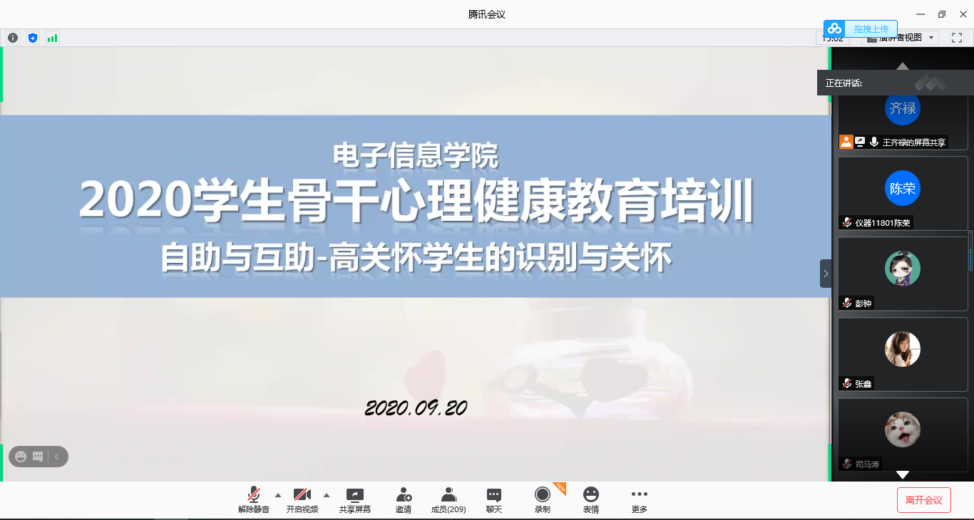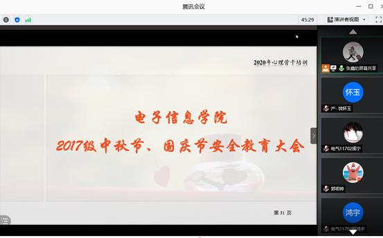 为加强员工心理健康教育,提高员工骨干应对心理问题的能力,强调假期安全及毕业规划的重要性,9月20-26日,公司2017级、2018级、2019级员工通过线上、线下等多种形式开展了以“自助与互助-高关怀员工的识别与关怀”为主题的心理骨干培训及中秋节、国庆节安全教育大会,电信公司各年级辅导员担任讲,各年级班长、团支书、安全委员、心理委员、寝室长参加了此次培训。