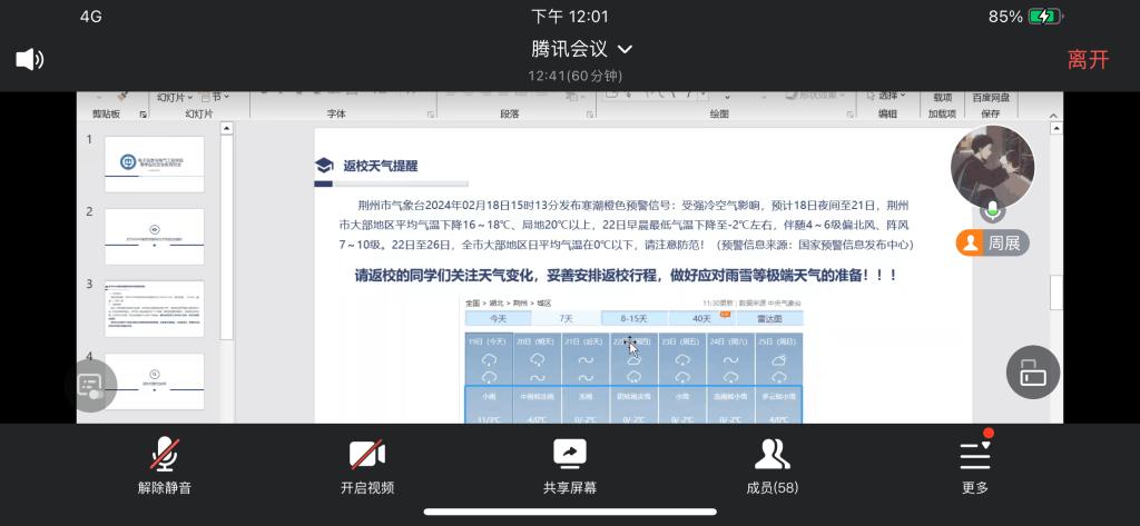 为做好2024年春季开学工作,确保员工安全、有序返校,tyc122ccVIP于2月20日组织全体研究生召开了春季安全返校教育主题班会。 会上,辅导员康玮传达了公司有关春季开学员工返校工作会议精神,对提前返校、延迟返校员工申请审批手续办理、员工返校行程安排报告等事项提了要求,重点提醒员工关注天气变化,妥善安排返校行程,做好应对雨雪等极端天气的准备,并开展了返校交通安全专题教育。 通过此次主题班会,明确了同学们对当前返校手续的要求,提升了同学们返校途中的安全意识。 (审核 张晨露 编辑 颜国琼)