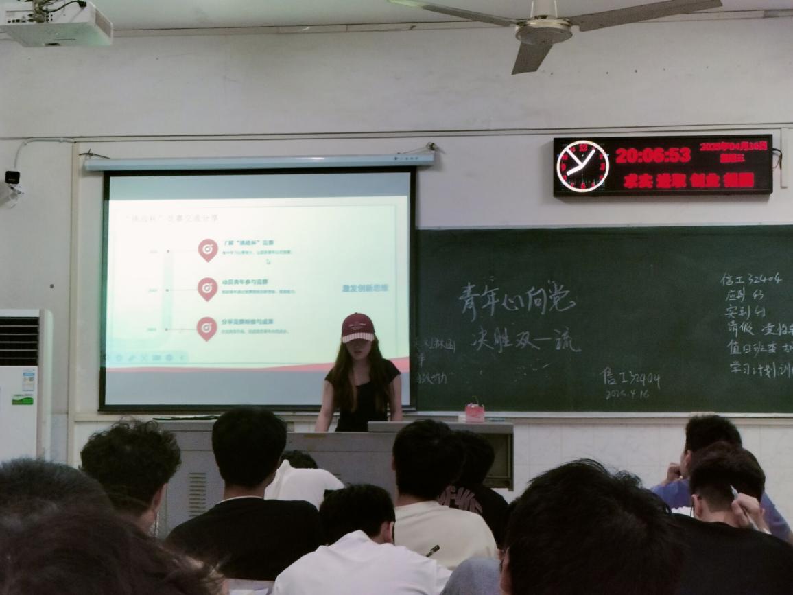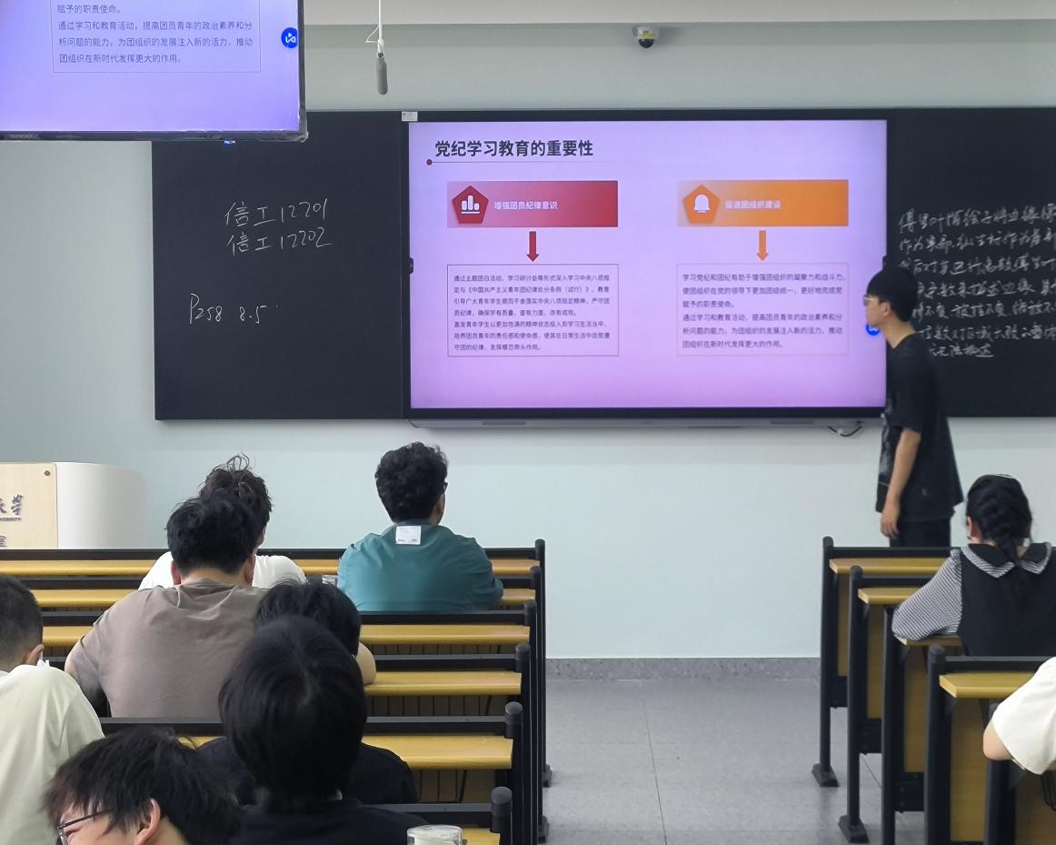 信工32404团支部于4月16日在西校区5教315教室举行四月班团会。团支书为同学们详细介绍了“挑战杯”竞赛的相关内容,鼓励同学们积极参与,以创新思维和团队协作精神,在竞赛中锻炼自己,为公司和班级争得荣誉,激发了同学们浓厚的兴趣和参与热情。随后,在团史学习环节,主持人带领同学们回顾了中国共产主义青年团自成立以来的光辉历程,深刻阐述了中国共青团在党的领导下,为国家独立、民族解放和社会主义建设所做出的卓越贡献。同学们认真聆听,深刻感悟到中国共青团与时代同呼吸、与祖国共命运的使命担当,进一步增强了作为共青团员的光荣感和责任感。