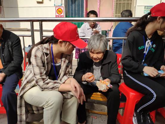 尽管天气寒冷,志愿者们仍然全部准时到达集合地点,在经过半个小时的路程后,同学们到达了荆州市金秋老年公寓,经理等人对于同学们的到来也表示了欢迎,爷爷奶奶看到了同学们,脸上也洋溢出幸福的笑容。根据同学们事先分配好的任务,每个人一来到老年公寓就主动开始了工作,有人扫地,有人切水果,有人搬凳子,还有人坐在老人旁边聊天、、、打扫完毕后,同学们愉快地和老人们做着游戏,不仅同学们和班主任老师阮宁君都献上了自己擅长的歌曲节目,就连老人们主动为同学们展现美妙的歌喉,现场十分热闹。看着老人们脸上温暖的笑容,同学们也感到无比的开心。