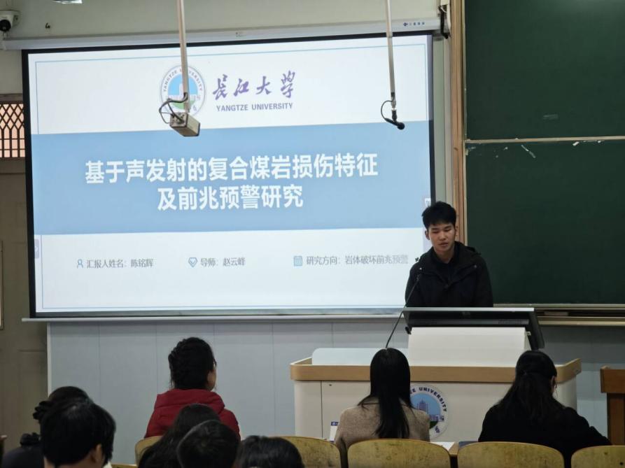 在技术应用与学科交叉环节,tyc122ccVIP的尹恒同学与城市建设公司的陈铭辉同学先后展示了各自的研究成果,尹恒同学深入剖析了边缘计算在油井动液面测量中的应用,并分享了其成果在国际会议SPWLA上的报告经历,展示了传统能源领域的智能化转型前景;陈铭辉同学则结合详实数据,讲解了声发射技术在复合煤岩损伤特征及前兆预警中的应用进展。两位的汇报不仅逻辑严密,更生动体现了跨学科技术在解决实际工程难题中的重要价值,引发了现场师生的热烈探讨。