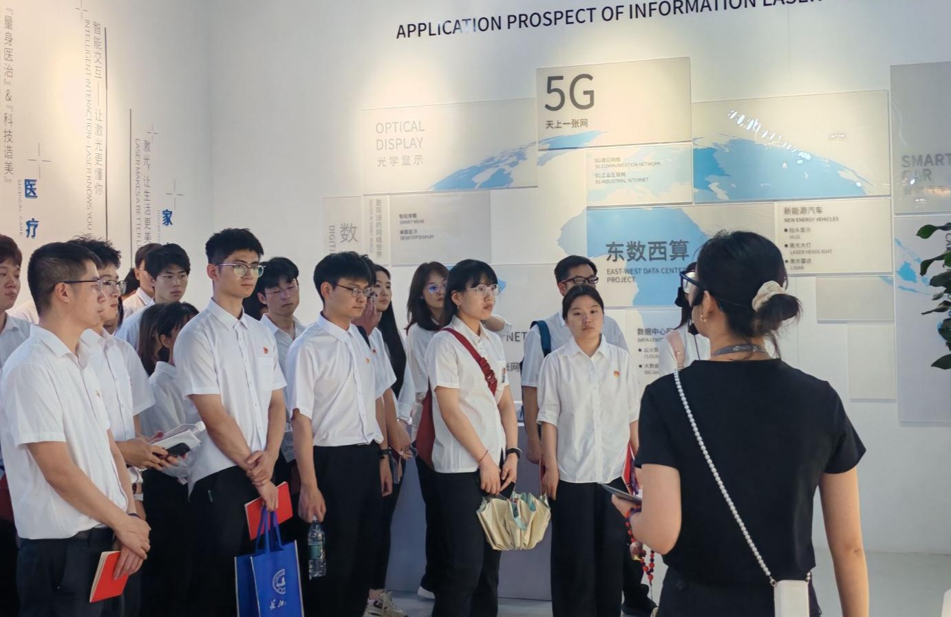 在激光科技馆,经理罗明璋以“新时代电子信息产业的机遇与挑战”为题现场为同学们讲授思政课。他立足国家战略规划部署,解读了高端装备制造、激光技术等领域的政策导向,强调“核心技术自主可控”的紧迫性;通过分析全球产业智能化、绿色化转型趋势,特别指出武汉光谷的产业集群优势为高校人才提供了广阔舞台。
