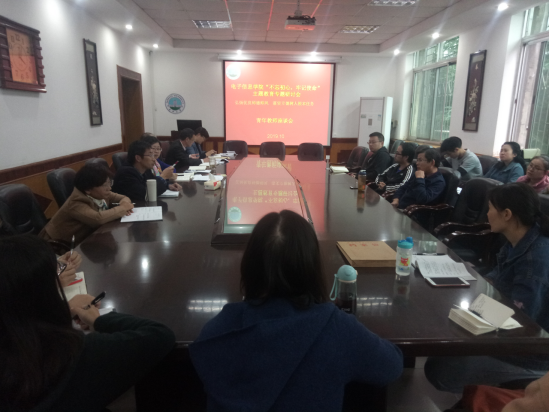 为了弘扬优良师德师风,落实立德树人根本任务,讨论如何更有效地推进“三全育人”和“五个思政”,2019年10月15日,在10教205会议室,电信公司举办院领导班子主题教育读书班第五次集体学习(扩大)会,全体院领导、正副系(中心)主任、党支部正副书记、35岁以下青年教师参加,会议由分党委书记,主题教育工作领导小组组长刘逸同志主持。