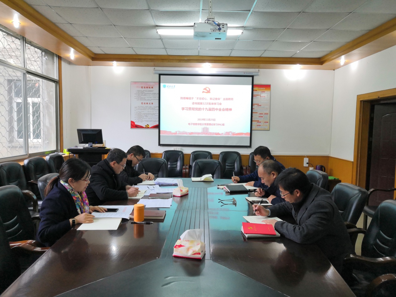 2019年11月25日下午2:00,公司领导班子“不忘初心、牢记使命”主题教育读书班第十二次集体学习会——学习贯彻党的十九届四中全会精神在10教203会议室举行。学习会由分党委书记刘逸同志主持,副经理蔡昌新、吴爱平、陈永军、分党委副书记郭启炜参加学习。