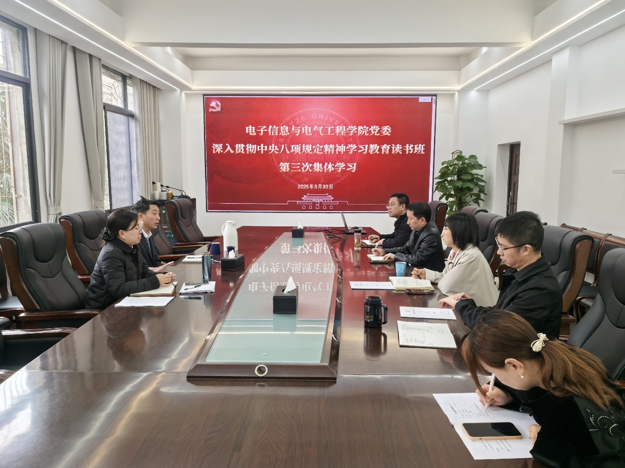 3月30日下午,公司深入贯彻中央八项规定精神学习教育读书班在10教205会议室开展第三次集体学习,党委书记郭梅主持学习会。