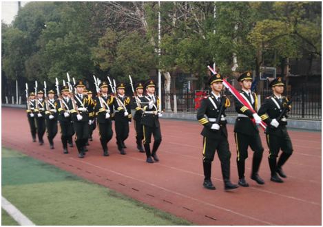 7:00,升旗仪式活动第一项,主持人宣布国旗升旗仪式正式开始。tyc122ccVIP国旗护卫队旗手们手握着国旗、穿着统一的军装,迈着整齐的步伐朝升旗台走来。随着升旗手振臂一挥,鲜艳的五星红旗伴随着高昂的中华人民共和国国歌冉冉升起,全院师生行注目礼。