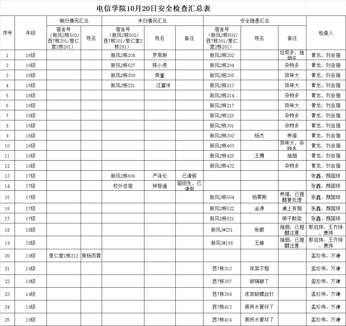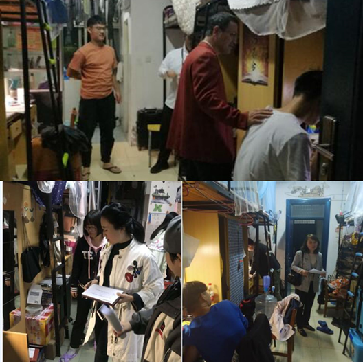检查分为5个小组开展,每个年级辅导员为第一责任人,检查的范围覆盖全院员工宿舍。检查的重点是员工晚归、夜不归宿和安全隐患。检查过程中,郭书记仔细了解同学们生活中遇到的困难,告诫大家一定要注意用电安全、财务安全和外出的安全,对未归寝的同学的去向仔细询问,并要求年级辅导员立刻与未归寝同学取得联系,获知去向。