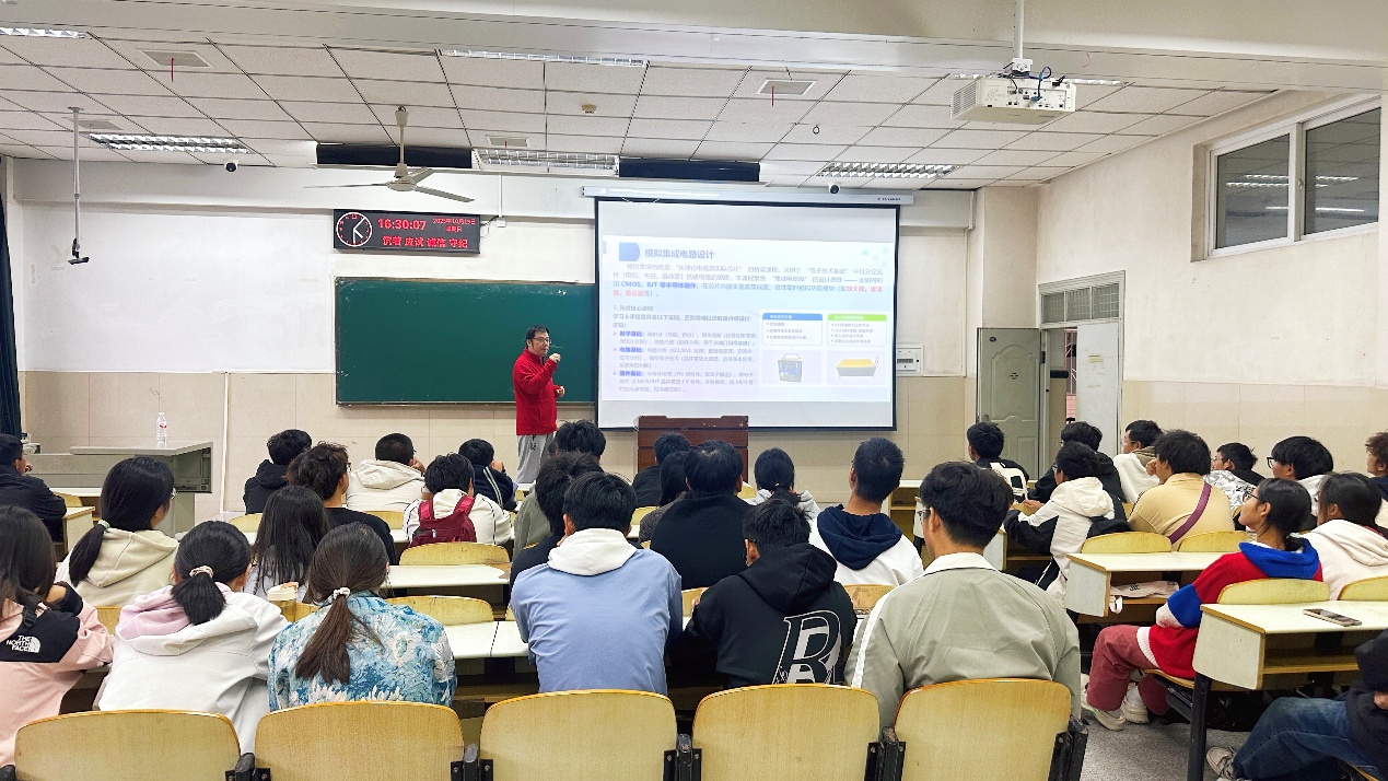 报告厅内,新生们目光炯炯,充满期待。魏老师从汹涌澎湃的“时代浪潮与专业使命”讲起,将人工智能、集成电路等前沿领域与国家战略需求紧密相连,点燃了同学们心中的责任与豪情。紧接着,他如数家珍般地介绍了公司的辉煌历史和雄厚的办学实力,一幅清晰的公司发展脉络图谱展现在大家眼前。
